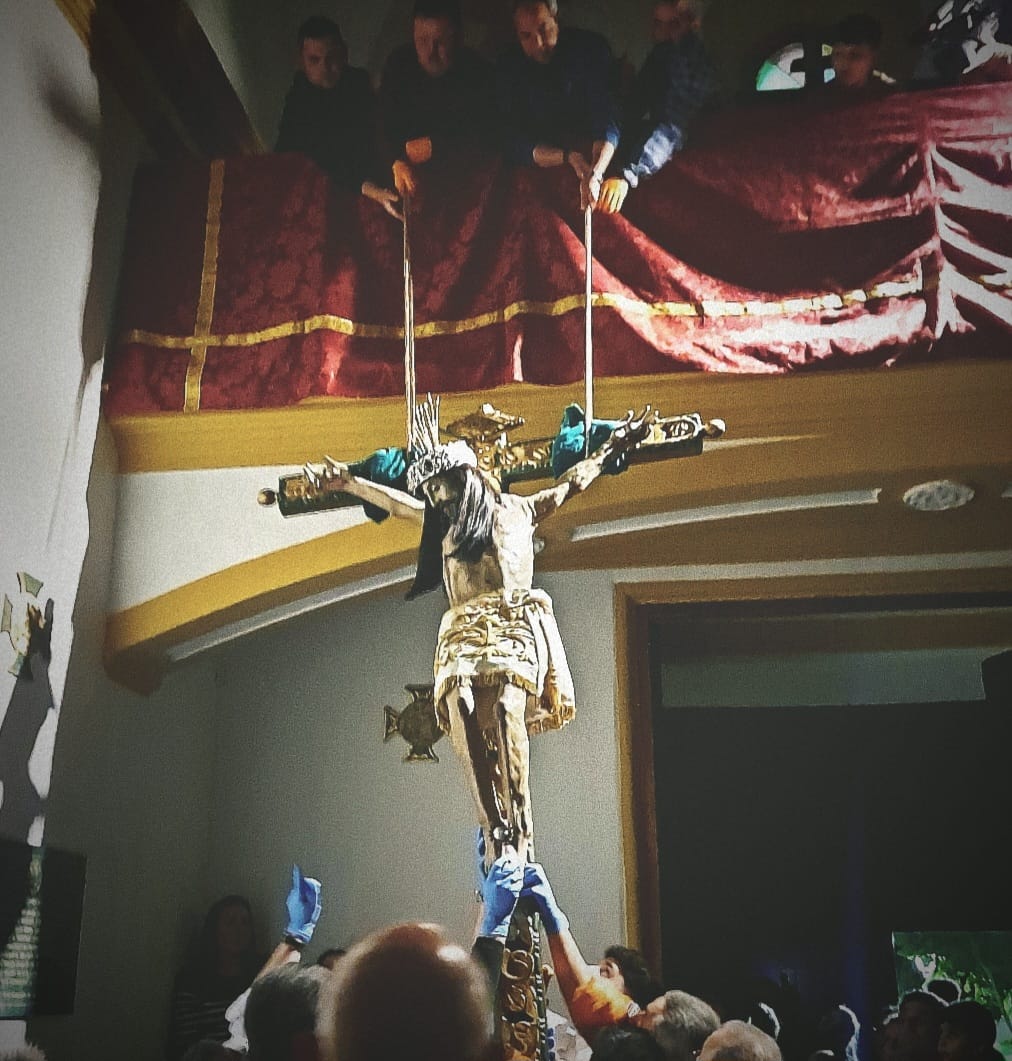 Imagen 2, 3 y 4: subida del Santísimo Cristo de la Sangre al Paso de Procesión para el Viernes Santo. Sábado 22 de marzo de 2024.